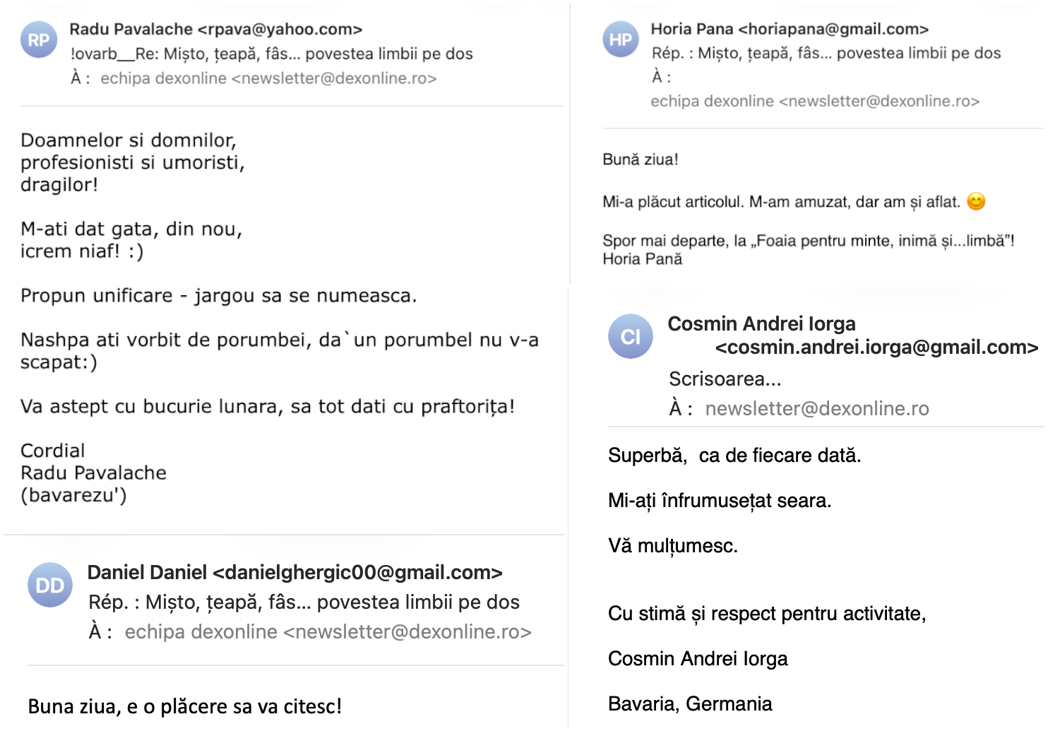 Ceea ce scriem în newsletter și facem la dexonline în general e sincer și cinstit față de noi și preocupările noastre lingvistice. Prin urmare, dacă există cititori care remarcă asta și rezonează cu pasiunile noastre, vor aprecia tot sincer și cinstit în raport cu ei înșiși…