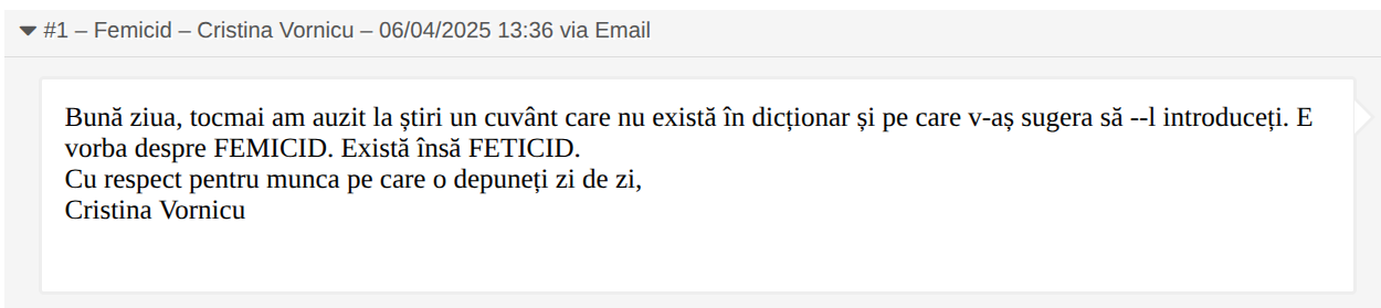 Ne declarăm impresionați că termenul este definit în legislația Republicii Moldova, mai responsabilă, pare-se, cu propriile-i doamne decât România. De la ei ne-am permis să-l preluăm și noi. De astăzi puteți găsi definiția termenului femicid și pe dexonline!