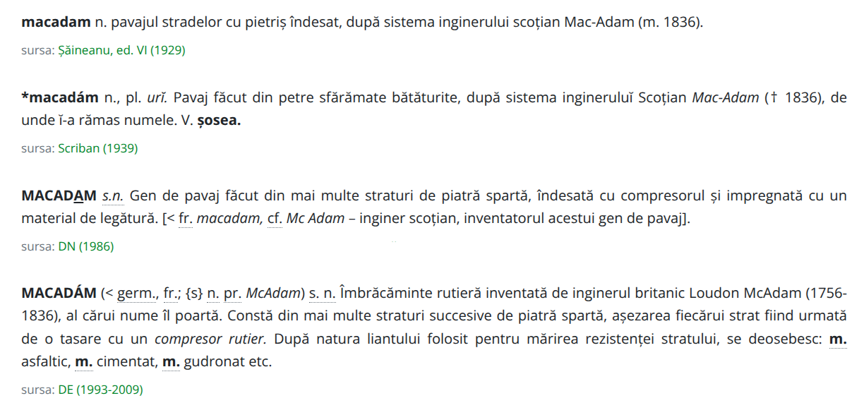 Însă în ceea ce privește indicațiile din dicționarele prezente pe dexonline, trebuie să știți că, îndeobște, acestea menționează limbile cele mai probabile care au stat la baza intrării cuvintelor respective în limba română, deci nu a celei primare. Nu se menționează limba în care a fost creat cuvântul, de fapt. O fi bine? O fi rău? Tu te-ntreabă și socoate... Mai precis, deși macadam este un cuvânt cu origini în limba engleză, a intrat în română prin franceză sau germană, de aici confuzia...