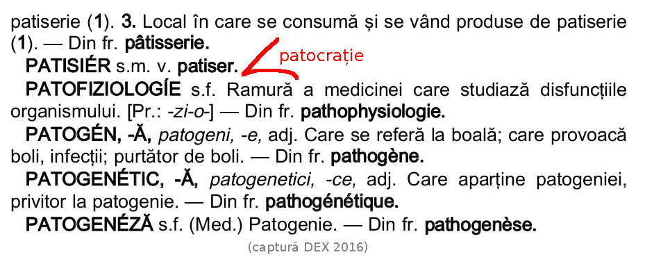 Primul secret al lui Polichinelle: patocrație nu a existat niciodată în dicționar (vezi captura de mai jos). În niciunul. Nici în română, nici în alte limbi. Ca atare nu a existat nici pe dexonline, deci n-avea cum să fie șters... Și oricum, e un gest pe care nu l-am face niciodată din principiu și pentru că pur și simplu ar fi fără rost: o minimă logică arată că dacă-l ștergem de pe dexonline, nu se șterge și din DEX-ul de hârtie...