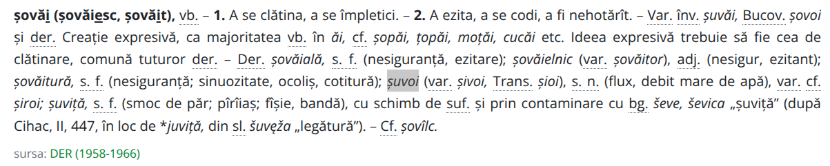 Pentru șuvoi, în dicționarele noastre apar cel puțin două explicații. Prima vorbește despre derivarea din maghiarul sió (termen cu accepțiunea principală identică, ca în A magyar nyelv értelmező szótára, vezi aici), a doua, tot la Ciorănescu, cu variantele șivoi, șioi, derivat din șovăi, acesta din urmă considerat a fi o creație expresivă.